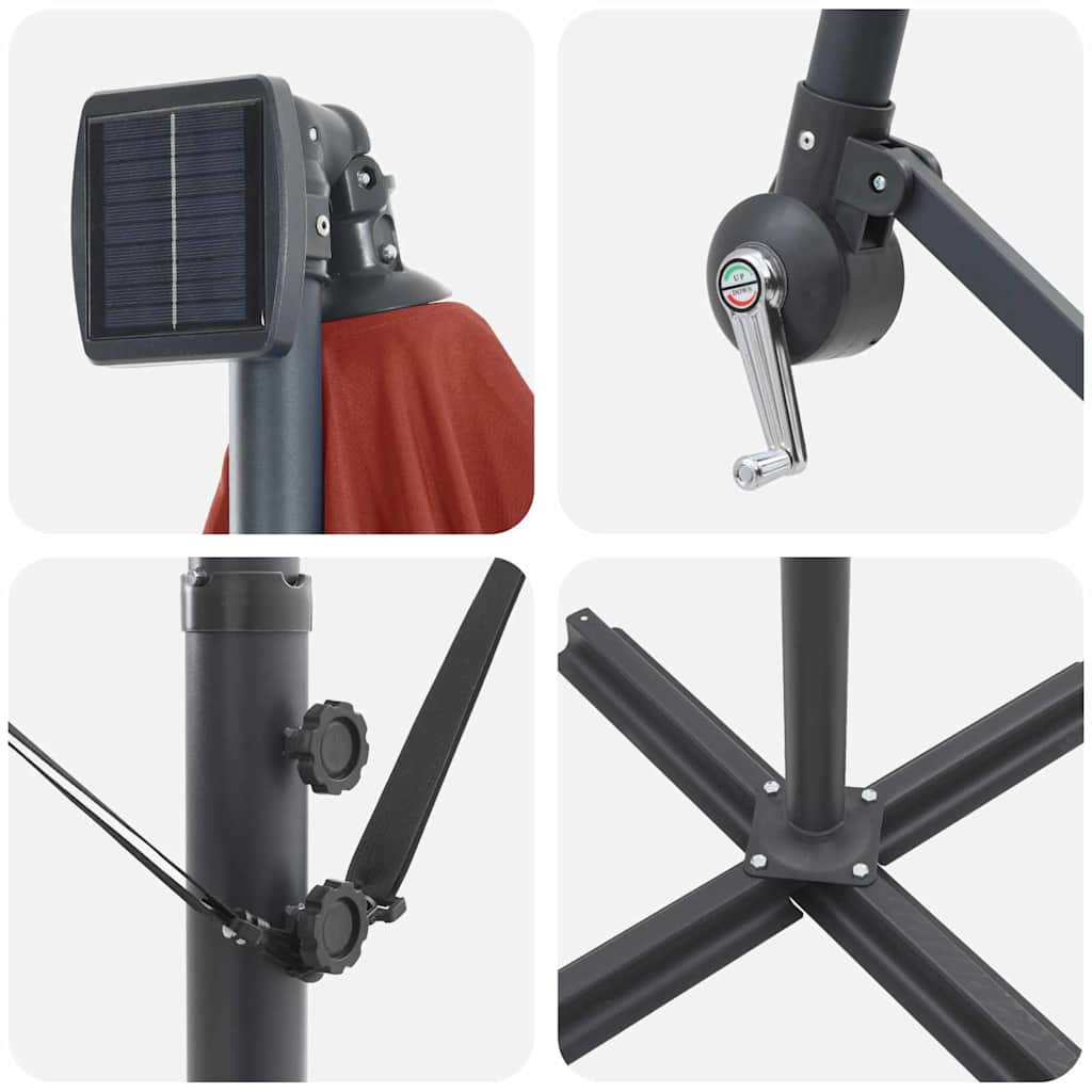 - Iluminação LED: Com luzes LED econômicas e movidas a energia solar, esse guarda-sol dá um toque estiloso e útil. A iluminação é ideal pra encontros à noite, deixando você aproveitar lá fora mesmo após o pôr do sol.