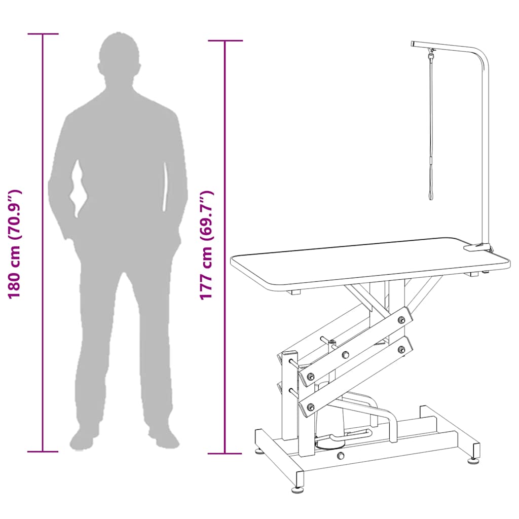 Esta mesa hidráulica de tratamento é perfeita para uso doméstico como mobiliário de preparação, exposições de cães etc. Possui um tampo antiderrapante e uma estrutura de ferro com revestimento em pó com o braço e pés de tratamento ajustáveis.