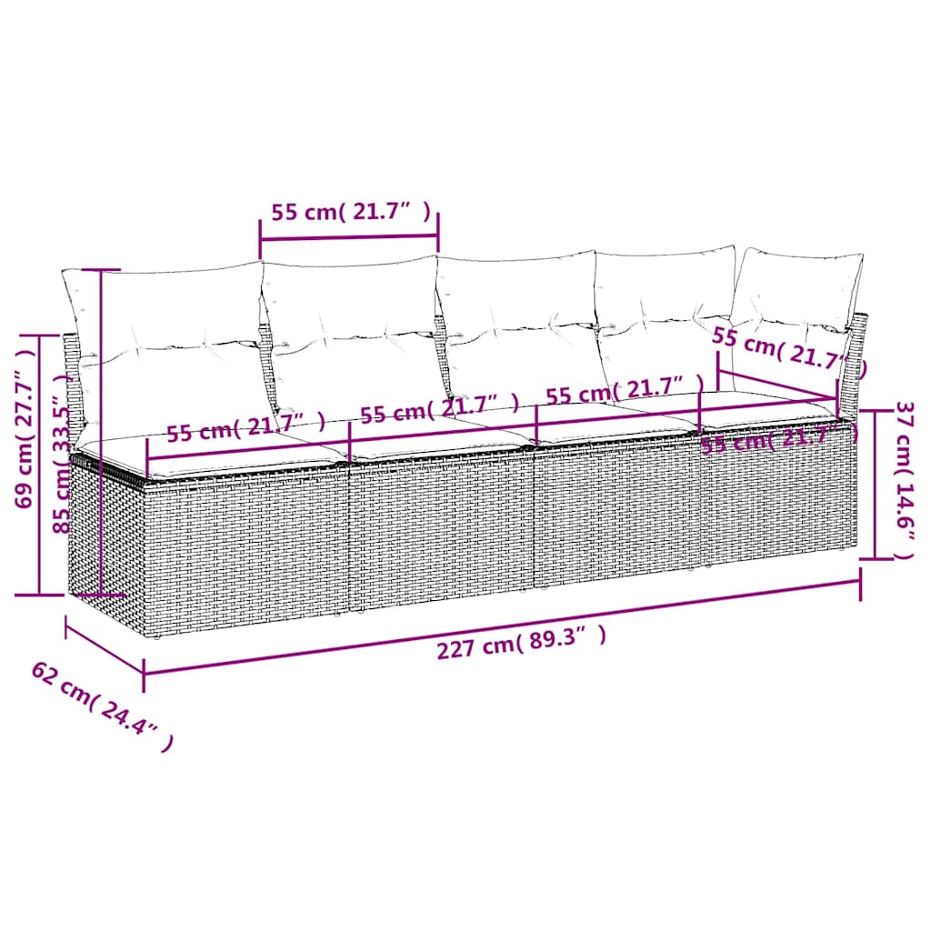 Sofá de jardim 4 lugares com almofadões vime PE cinzento