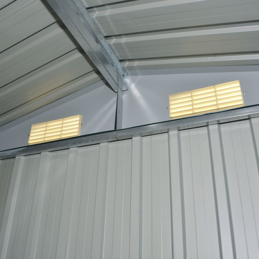 A construção em aço galvanizado, juntamente com um acabamento revestido de zinco, o torna durável e resistente, evitando corrosão ou danos causados por condições climáticas extremas. Ele também inclui uma estrutura de piso de aço que adiciona estabilidade e é perfeita para um acabamento de piso de madeira (madeira não incluída).