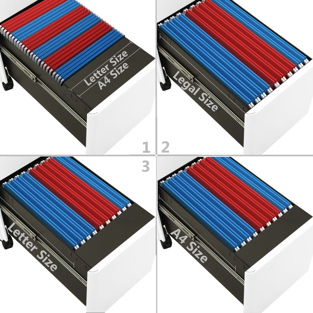 Este armário de escritório é feito de aço, tornando-o durável e fácil de limpar. Com 3 gavetas e 1 fechadura, o arquivador permite que organize devidamente os seus ficheiros em diferentes categorias e os mantenha seguros. Cada gaveta está equipada com 1 barra de pendurar, que pode ser livremente combinada para arrumar pastas suspensas para o arquivo de ficheiros de vários tamanhos. O arquivador móvel possui uma bandeja para lápis, que pode tornar a sua secretária mais organizada. As gavetas com corrediças de 3 secções e rolamentos de esferas, asseguram uma abertura e fecho suaves, mesmo sob uma grande carga. Estas gavetas podem ser completamente estendidas. Os cantos esquerdo e direito do armário são redondos.