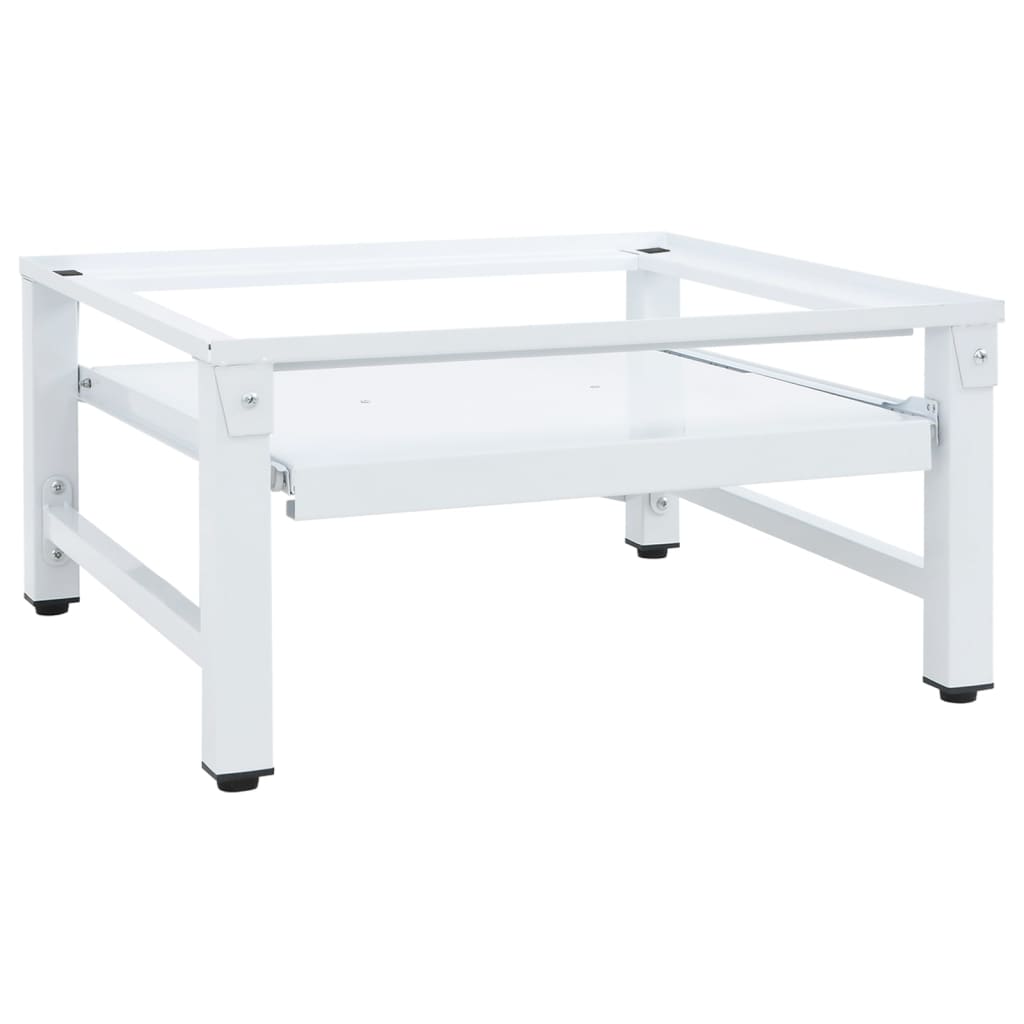 Este suporte de máquina de lavar com uma prateleira extraível foi concebido para manter aparelhos, tais como máquinas de lavar roupa, afastados do chão e elevá-los a uma altura de funcionamento mais adequada.